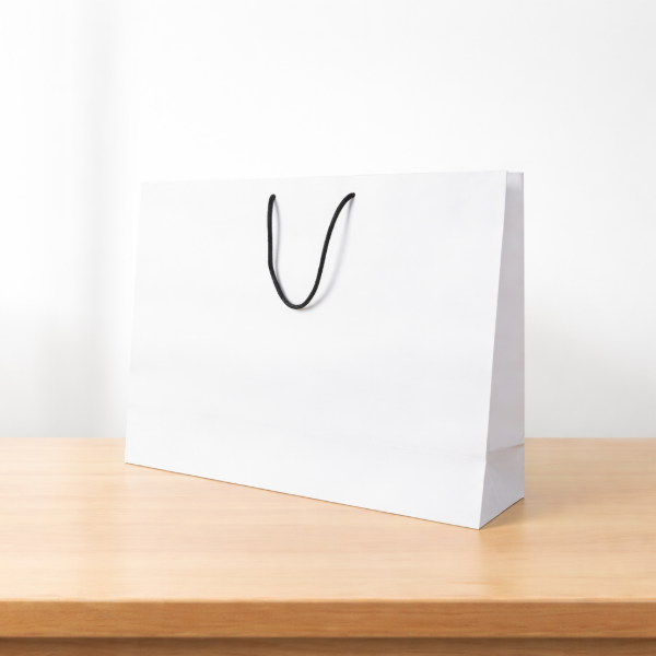 Bolsa de papel kraft blanco de alta calidad, ideal para una presentación más limpia y elegante de tu marca. Con medidas de 30 x 40 x 12 cm, es perfecta para productos de mayor tamaño o volumen, ofreciendo practicidad y un acabado prolijo.